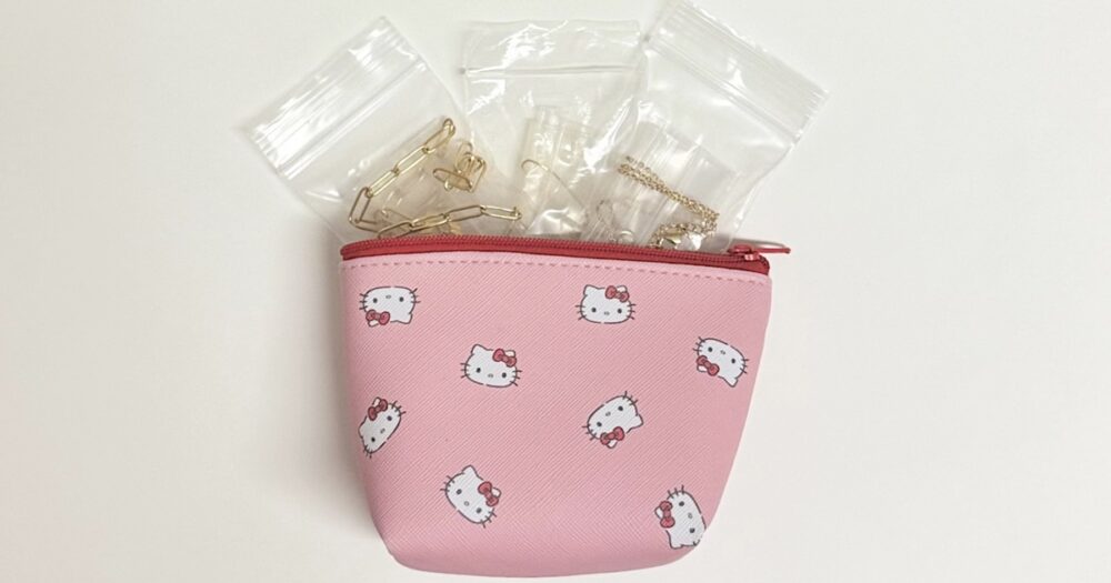 こちらも先程のジュエリーボックス保管と同じで、ジップ袋をゴムでまとめ、ポーチに収納します。できれば衝撃を考慮して、硬い素材やクッションが入ったものがおすすめですが、使いやすいものでいいです。ただし、旅先では失くす可能性もあるので持って行くのは少なめにしてくださいね。